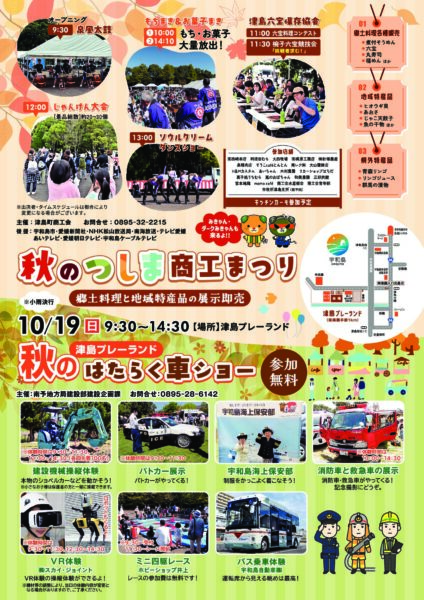 本商工会では、郷土料理と地域特産品の展示即売を行う「秋のつしま商工まつり」を開催します。今回も、はたらく車ショーと同時開催いたします。