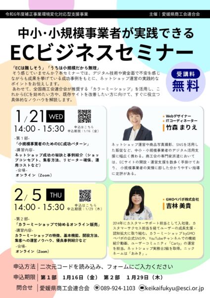 愛媛県商工会連合会では、自社ネットショップによるビジネス展開の魅力とともに、カラーミーショップ運営の実践的なノウハウをお伝えします。