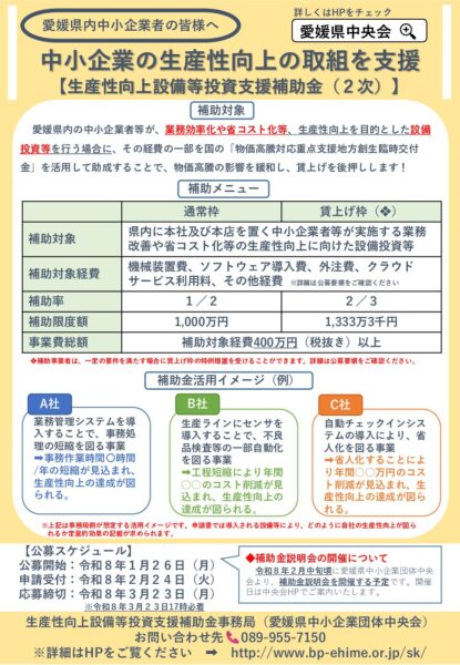 津島町商工会からのお知らせ 2026年1月28日生産性向上設備等投資支援補助金(2次)の公募開始について 愛媛県中小企業団体中央会では、物価高騰による経済環境の変化に対応するため、県内中小企業の業務効率化や省コスト化等の生産性向上を目的とした設備投資を支援する補助金事業を実施します。 受付開始:令和8年2月24日(火) 応募締切:令和8年3月23日(月)17:00必着 詳しくは、関連リンクをご覧ください。 関連リンク 愛媛県中小企業団体中央会ホームページ 関連ファイル 案内チラシ お知らせ一覧へ