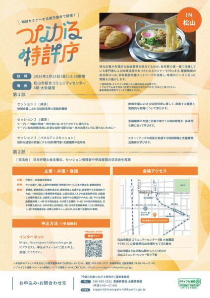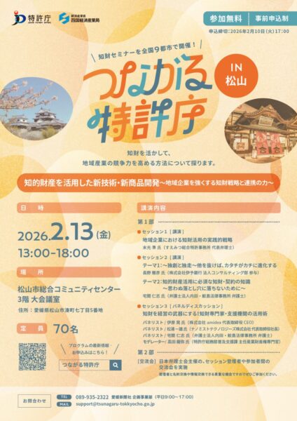 津島町商工会からのお知らせ 2026年1月28日「つながる特許庁 in 松山」の開催について 特許庁では、企業経営における知財活用の喚起を図るため、先進事例の紹介やパネルディスカッション等を行います。 ・開催日時 令和8年2月13日(金) 13時〜18時 ・開催場所 松山市総合コミュニティセンター 3階 大会議室(松山市湊町七丁目5番地) 詳しくは、関連リンクをご覧ください。 関連リンク 特許庁ホームページ つながる特許庁特別サイト 関連ファイル セミナーチラシ お知らせ一覧へ