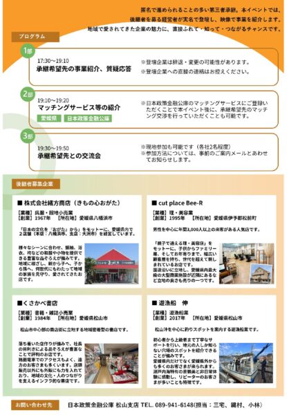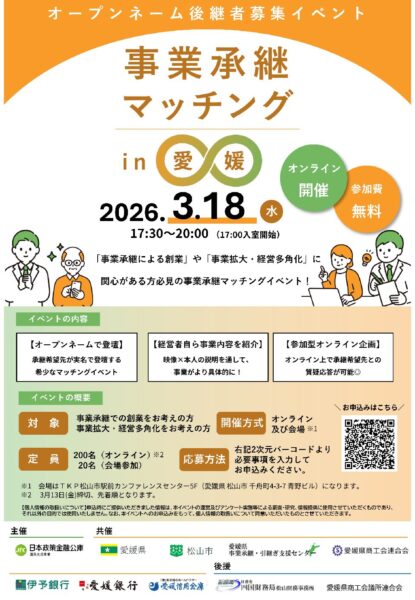 日本政策金融公庫松山支店では、「事業承継による創業」や「M&Aによる事業拡大・経営多角化等」に関心がある方等を対象に、オープンネーム(実名公開)でのマッチングイベントを開催します。