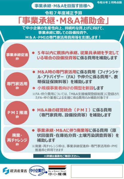 津島町商工会からのお知らせ 2026年2月20日事業承継・M&A補助金の14次公募説明会の開催について 中小企業庁では、中小・小規模事業者の事業承継に伴う設備投資等を支援する補助金を公募しており、このたび、申請手続き等に関するオンライン説明会を開催します。 開催日時:令和8年3月6日(金)14:00~ 申込〆切:令和8年3月4日(水)17:00 詳しくは、関連リンクをご覧ください。 関連リンク 参加申込ページ 補助金ページ 関連ファイル 補助金案内チラシ お知らせ一覧へ
