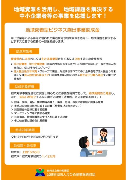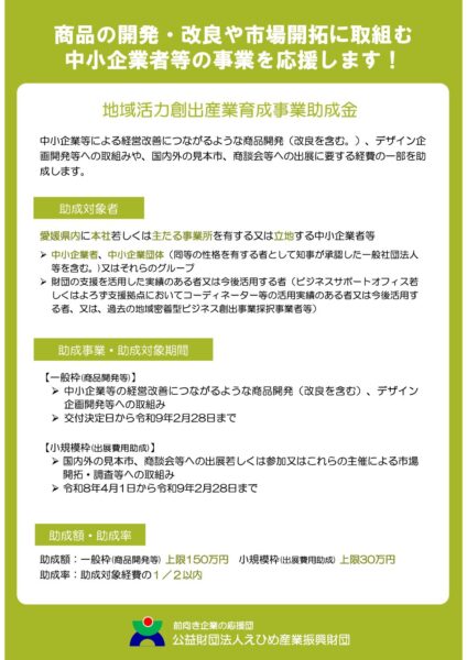 えひめ産業振興財団 では、地域資源を活用したビジネス展開や経営改善につながる商品開発、商談会出展等に要する経費の一部を助成します。
