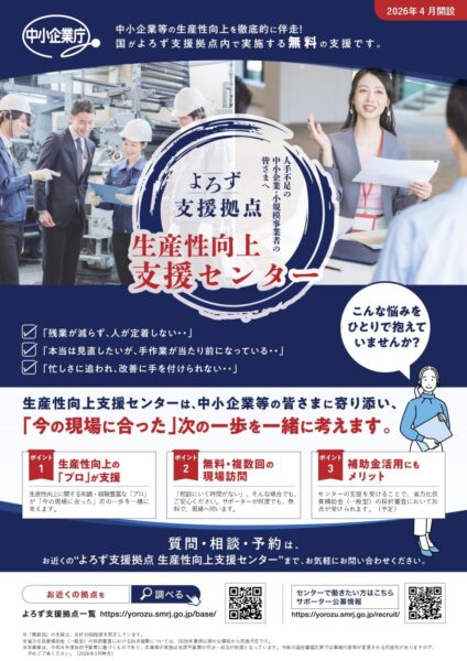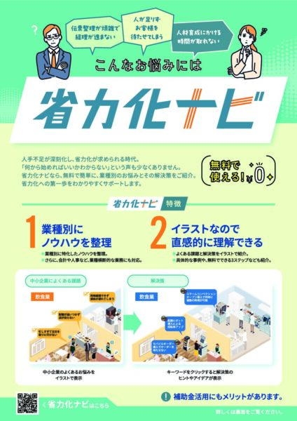 津島町商工会からのお知らせ 2026年4月6日「省力化ナビ」及び「生産性向上支援センター」の開設について 中小企業庁等では、中小・小規模事業者における省力化・生産性向上等の支援の一環として情報サイト及び相談窓口を開設しました。 詳しくは、関連リンクをご覧ください。 関連リンク 省力化ナビ 生産性向上支援センター 関連ファイル 案内チラシ(省力化ナビ) 案内チラシ(生産性向上支援センター) お知らせ一覧へ