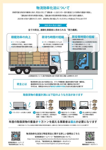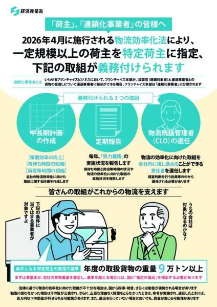 津島町商工会からのお知らせ 2026年4月8日物流効率化法の全面施行について 経済産業省では、物資の流通の効率化に関する法律(通称:物流効率化法)の改正を踏まえ、特定荷主に課された責任等の周知を図っています。 詳しくは、関連リンクをご覧ください。 関連リンク 経済産業省ホームページ 物流効率化法理解促進ポータルサイト 関連ファイル リーフレット お知らせ一覧へ