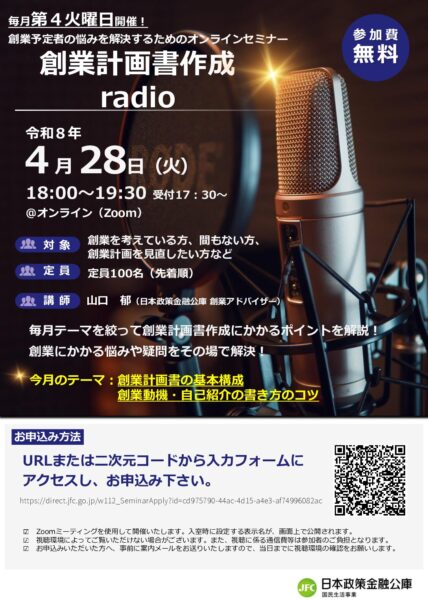 津島町商工会からのお知らせ 2026年4月17日日本政策金融公庫「創業計画書作成radio」について 日本政策金融公庫では、創業予定者等を対象とした、全3回で創業計画書の書き方が習得できるオンラインセミナーを開催します。 詳しくは、関連リンクをご覧ください。 関連リンク 日本政策金融公庫ホームページ 関連ファイル 案内チラシ お知らせ一覧へ